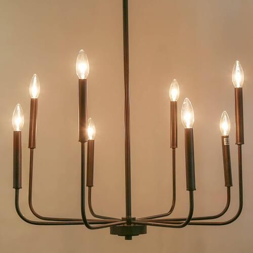 Paslanmaz metal gövdeye ve ayarlanabilir askı setine sahip, sekiz adet duy bulunan şamdan avize.